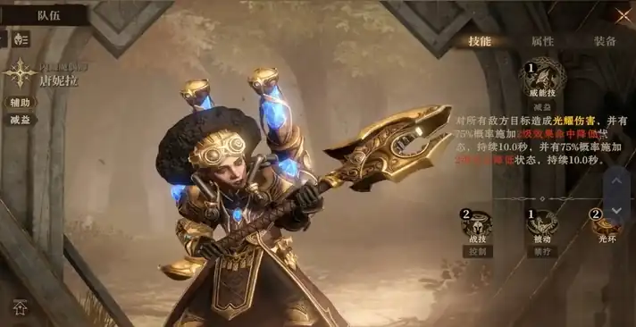 威能技“完美合作”,释放后对所有敌方目标造成700%攻击力的光耀伤害,并有75%的几率施加2级命中降低效果,另外还有75%概率施加2级攻击力降低,降低对手的专注力,进一步削弱敌人的战斗力,在持久战斗中发挥的作用尤为明显,能有限限制敌人的持续作战能力,给己方创造优势。
