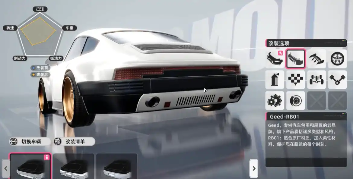 异环车型改装玩法还是比较完整的,首先玩家们点开车辆选择,车辆里面有两个选项,一个是维修,另一个则是改装,点击改装以后就可以开始正式改装了,改装的部件是比较简单的,从车身到车尾的每个组建都是可以二次装修的。