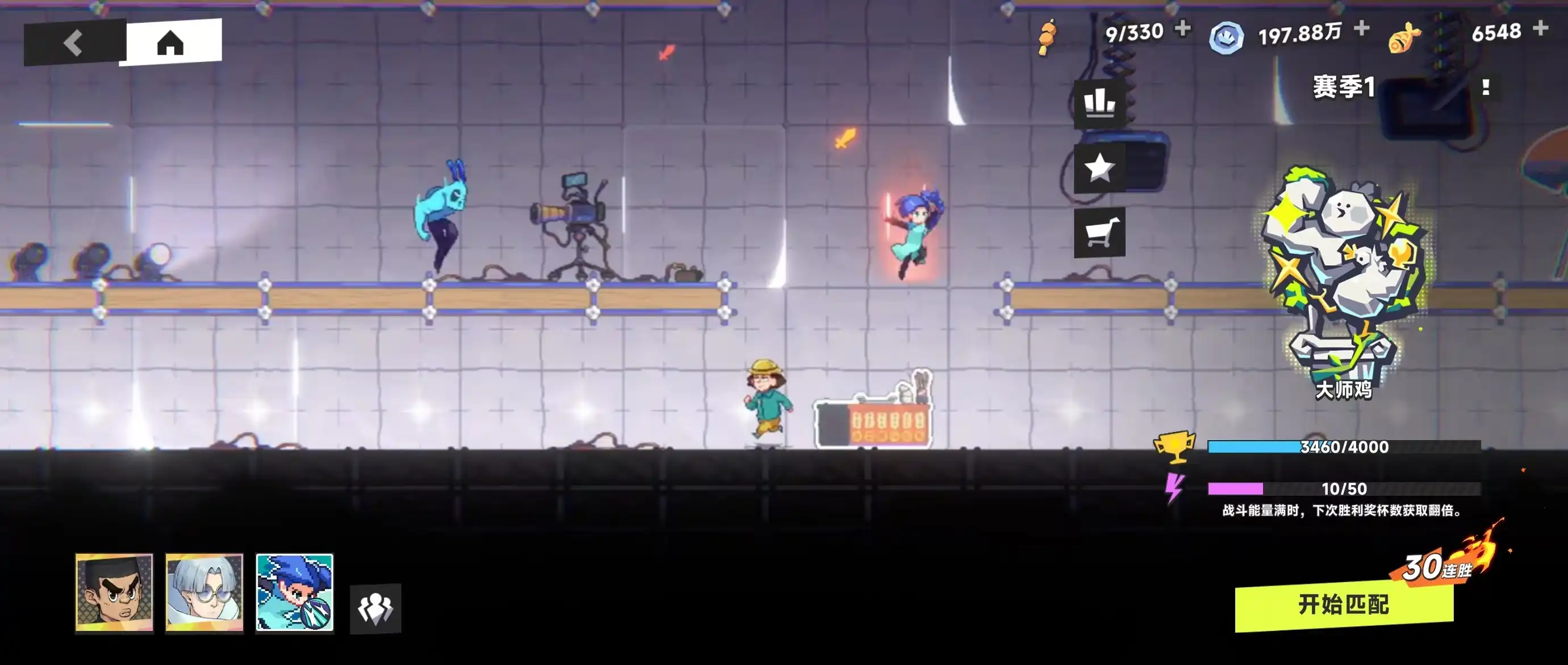 首先是在角色选择方面,小编非常推荐大家使用何大春和斯特国王子,因为这两个角色的强势是毋庸置疑的。何大春的特点在于自身的大招伤害高,而且很难被对方躲掉,这样就给最后的单挑环节赢得了优势。斯特国王子能跳得很高,但下落比较慢,在空中进行普攻的时候容易挨打,一技能可以间断式打出远程伤害,二技能造成远程爆炸伤害,都是非常适合单体攻击的技能,所以单挑也很强。