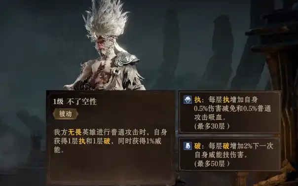 游戏里戏里色有一个名叫不了空性的被动技能,这个技能的作用就是自身阵营英雄攻击的时候,角色可以源源不断的给自身叠加1%的威能,这个过程中还能得到0.5%的伤害减免,这两者一个最多叠加30层,一个最多叠加50层。