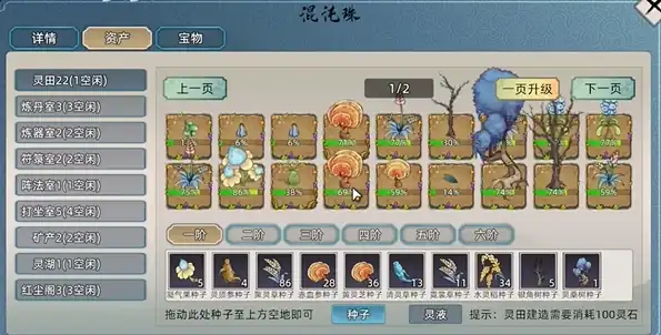 在混沌珠中开辟灵田,等级高,灵田数量就多,升级后,记得及时开辟新的灵田。灵田的数量直接影响到你的灵植产量,因此尽早升级混沌珠是关键。