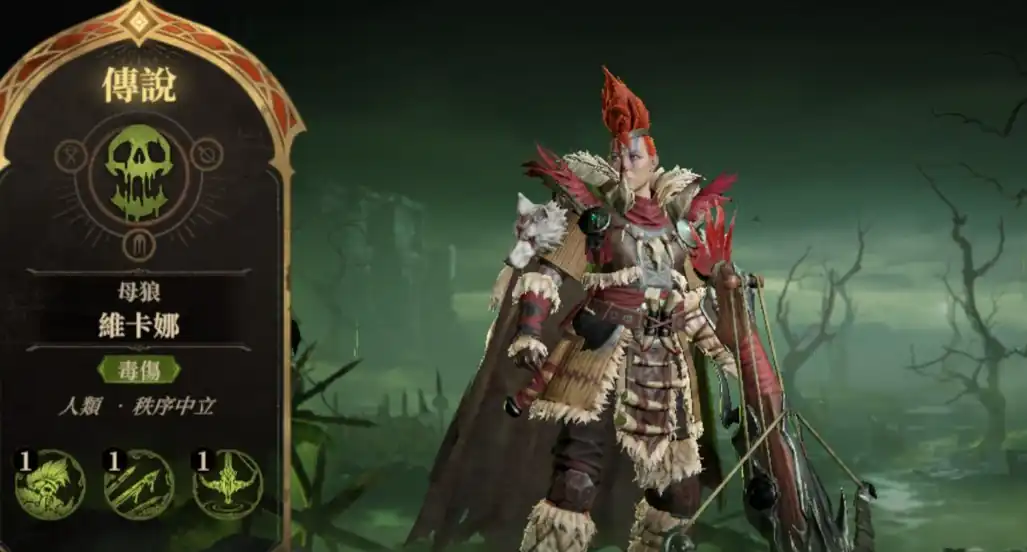 她的被动是在敌人被施加毒伤时,自身能获得1层持续时间无限的领悟增加,最多可叠加25层,她的战技会射出3发箭矢,每一发都会射向随机敌人并形成150%毒素伤害,并有75%几率施加15秒毒伤,她的威能技会向目标射出一箭,对范围内敌人形成500%毒素伤害,并对主目标标记10秒,在被标记的期间每次被施加毒伤时,都会引发毒爆,额外对范围内敌人产生派生伤害。