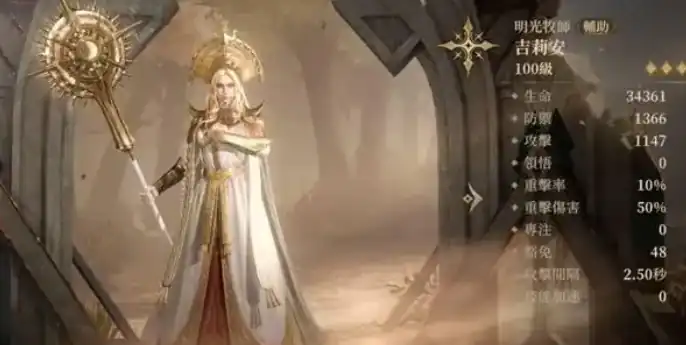 她的被动能在队内其他人受到致命攻击时,为对方添加一个不死buff、以持续回复buff,时长为5秒,如果该队友是远程系的话,还为帮助其施加隐形,让他无法成为单体技能的目标,她的战技会对范围内的队友进行治疗,并让其在5秒内能持续性的恢复,她的威能技会对全体队友施加一个10秒阵亡复活buff,然后复活已死亡的队友,被该招式复活的队友会恢复75%最大生命值和75%威能,此后还会对全体队友附加一个免疫减益,有10秒,对远程队友施加10秒隐形。