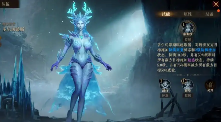 ”自然恩典”的战技使用后,对一个己方队友施加30%最大血量的护盾,护盾存续时,友方获得她30%的豁免。”海妖之歌”的威能技,使用后她吟唱歌谣,对所有的友方单位施加持续回复状态,外加2级防御增加效果,并且有50%的几率对所有的地方单位施加魅惑,且有75%几率让所有敌人的威能减少50%;持续回复能持续回复血量;2级防御可增加60%防御;魅惑让目标对友方进行攻击;威能减少知直接让对手的充能进度减少。