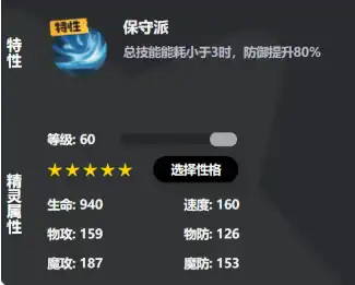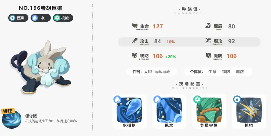 它的特性是“保守派”,这意味着当它使用能量消耗小于3的技能时,它的防御会提升80%。这不仅能让它在低消耗技能的情况下更好地承受伤害,还能提升它的生存能力,使它成为玩家队伍中的“铁壁”。