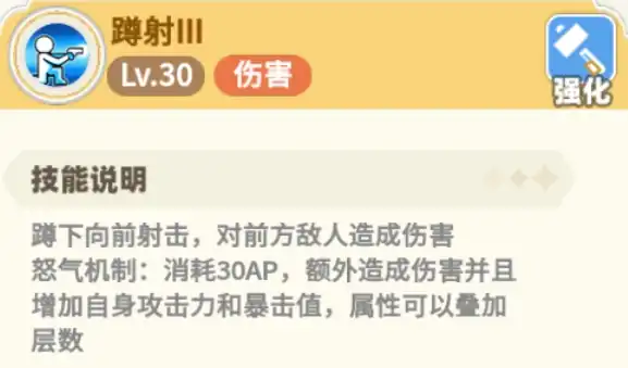 平民玩家们在这个职业上投入的资源基本上都可以在游戏中获取到,几乎不需要进行额外的氪金,对于双枪大家其实会比较眼熟,这个职业的玩法跟以前彩虹系列其他的同职业玩法是差不多的,前期加点大家没有足够资源先把射击类的技能加1点即可,主要用于学习后续的技能,而蹲射则是一个非常强力的BUFF类型技能,它能够增加暴击率和爆伤,对于提升输出能力有很大的帮助,因此玩家们需要将这个技能加满。