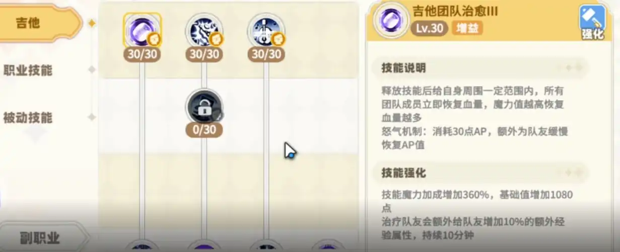 其中吉他团队治愈是必须优先加满的技能,这个技能能够给范围内的队友进行生命恢复,并且冷却时间只有8秒,为了让吉他治愈的有效性更高,其实最好把这个效果的加点优先级放在前面,此外七音封印也是一个非常实用的技能,它属于范围伤害技能不仅在副本中表现出色,在日常挂机时也能发挥出不错的效果,因此玩家们也需要将这个技能加满,以提升自己的输出能力。
