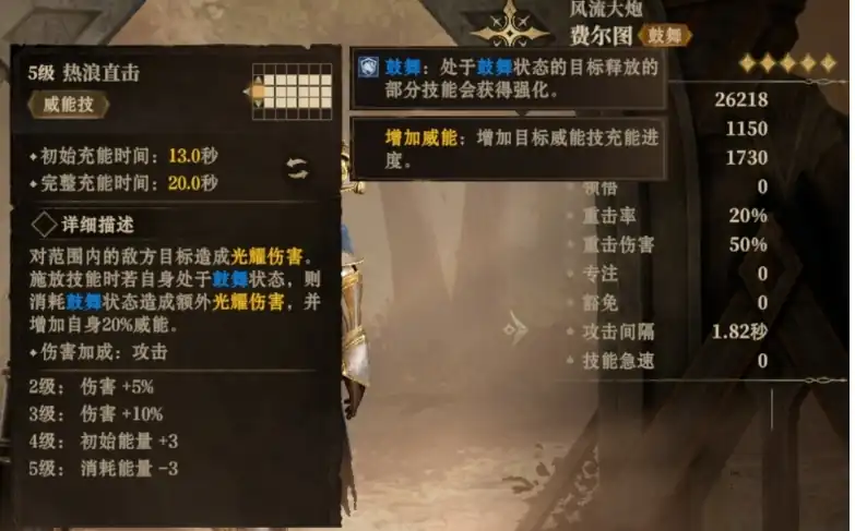 费尔图的威能技是热浪直击,当他施放这一技能时,会对范围内的敌方目标造成汹涌澎湃的光耀伤害,所到之处敌人无不遭受此元素攻击,如果在施放该技能时,其实在他本身之前鼓舞状态叠加的状态下没有消耗完的话,大家利用这个鼓舞的效果还可以消耗掉此状态直接变成额外的输出加入到基础伤害当中去,此类额外伤害也进一步加剧了对敌人的输出,同时这一技能还会为费尔图回复一定威能,从而提升他爆发的威力与频率。