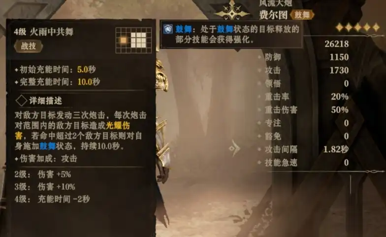 更为关键的是如果这次炮击命中了超过2个敌方目标,费尔图还会额外对自身施加鼓舞状态,这种鼓舞状态能够持续10 秒的时间,在鼓舞队中绝对不算少了,在这短暂的时间里,费尔图的各项能力会得到一定的提升,而且这也是费尔图在独自作战时获取鼓舞状态的唯一途径,大家可以当做他的一个核心用法。