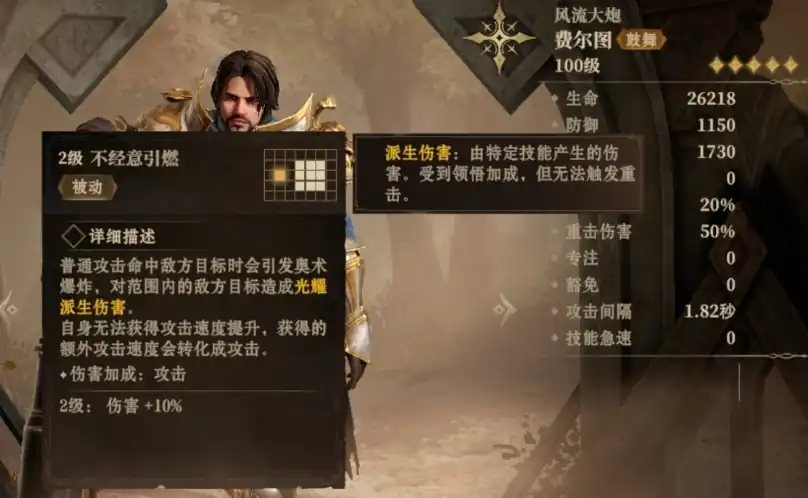 费尔图为人能言善辩,作为最高等级的传说卡,费尔图的实力自然属于强度榜前端的角色,然而不少玩家对他强大的能力却知之甚少,费尔图的定位是鼓舞,他在战斗中的作用不仅仅是用来输出的,更是一个能够激励团队发挥更强战斗力的灵魂人物,他的被动技能有两个效果,第一个被动效果是当他的普攻命中敌人的时候,会引发一场壮观的奥术爆炸,且会在敌人群体中炸裂,对范围内的敌人造成可观的光耀输出值。