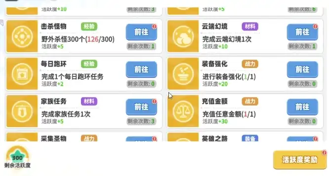如果过早地陷入经验副本挂机,可能会导致主线任务进度滞后,进而影响后续的内容解锁,转之后大家可以打开活跃度一栏,便能发现众多可以获取活跃度的方式,其中怪物大是除了升级以外唯一能够获得技能点的地方,每日会刷新5次,并且还可以额外购买5次,总计10次机会,玩家务必将这10次机会全部利用起来,以达到活跃度收益的最大化。