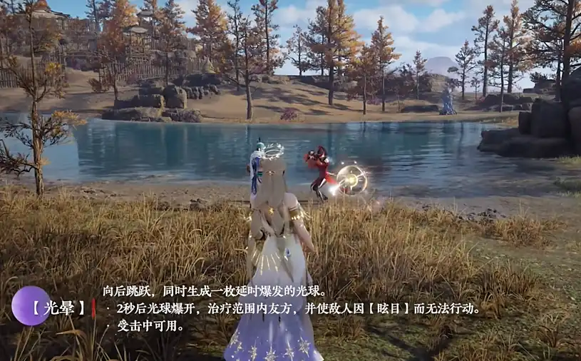 光晕是一个兼具防御与进攻的受击技能,在战斗中使用技能后会如敏捷的灵狐般向后跳跃,与此同时,一枚散发着神秘光芒的延时爆发光球悄然生成,2秒后光球轰然爆开,绽放出的光芒不仅能为范围内的友方英雄恢复生命值,技能非常实用,在后跳躲避伤害的同时,用爆开的光球打断敌人进攻节奏,为己方创造反击机会 ,光晕・瞬附在选定的目标地点生成一枚光球,光球爆炸后,同样能治疗己方队友并对敌人造成一定的控制效果,为队友回血的同时,在关键时刻爆炸眩晕敌人,帮助队友脱离危险。