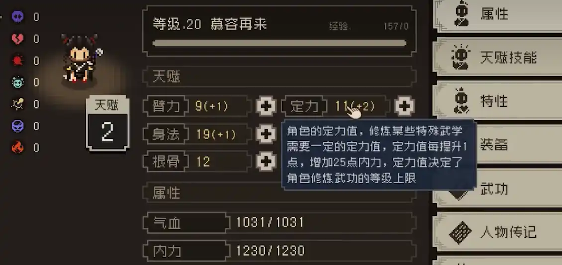 定力是非常独特的属性,它直接影响到内力的增加和武功的修炼上限。每提升一级定力,你将获得25点内力加成,这对于修炼一些特殊武功非常有帮助。同时,定力也决定了你能够修炼的武功等级上限,所以如果你希望自己的角色能修炼更强大的武技,定力加点至关重要。如果你注重内功和深厚的武学修为,定力绝对是你加点的优先选择。
