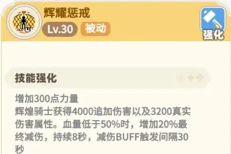 剑盾流派中的BUFF技能叫做辉耀惩戒,这个强大的辅助技能可以为使用者提供大量的属性加成,包括直接增加300点力量以及辉煌骑士状态下额外获得的4000点追加伤害和3200点真实伤害,当角色的生命值降至50%以下时,辉耀惩戒还会激活一种特殊的保护机制,就是在接下来的8秒内减少20%所受到的所有伤害,并且每隔30秒只能触发一次这样的减伤效果。