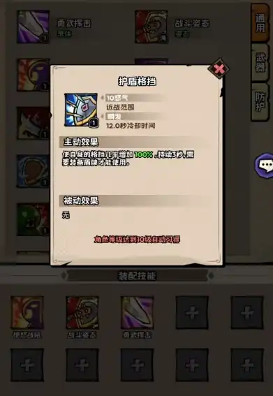 护盾格挡:角色等级达到10级自动习得,使自身的格挡几率增加100%,持续3秒,需要装备盾牌才能使用。