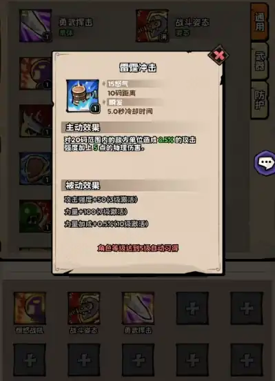 战士的职业技能当中有基础的技能也有后期根据等级解锁的,比如勇武挥击:对敌方单体目标造成政击强度107%加上5点物理伤害,被动效果攻击强度+50(3级激活),力量+75(7级激活),力量加成+O.5%(10级激活)。