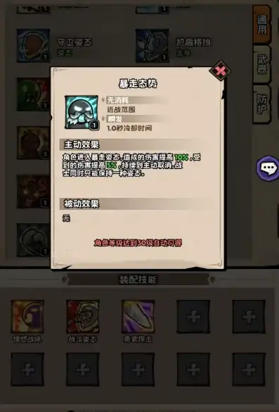 暴走态势:战士在30级的时候解锁的技能,角色进入暴走状态,造成的伤害提升10%,受到的伤害提高5%,持续到主动取消为止,同时只能保持一种姿态。
