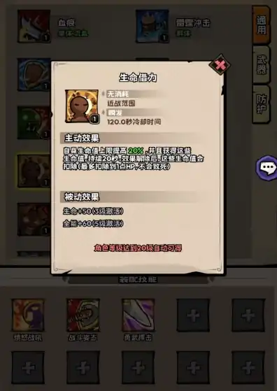 生命借力:这个技能的冷却时间达到120秒,主动效果是自身的生命值上限提高20%,并且获得这些生命值持续20秒时间,在效果解除之后这些生命值会扣除,最多会扣除1点HP,不会致死,被动效果生命+50(3级激活),全能+6O(5级激活),这个技能在角色等级达到20级自动习得。