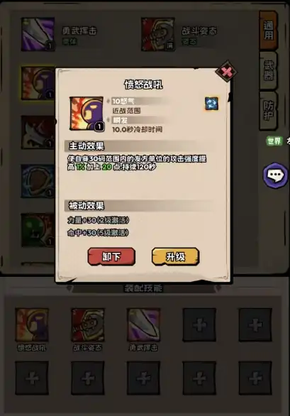 愤怒战吼:使自身30码范围内的友方单位的攻击强度提高1%加上20 点,持续120秒,被动效果是力量+30(2级激活),命中+30(5级激活)。