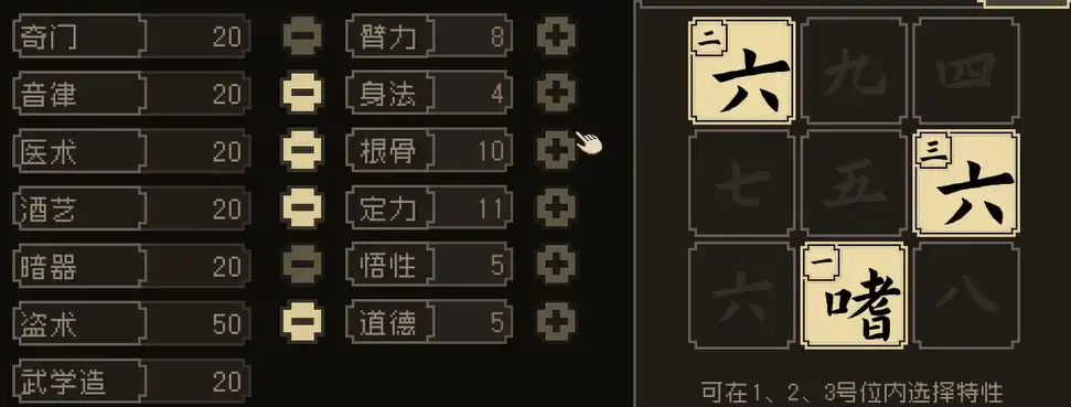 角色在创建时,最好根据自己未来的武学路线来合理分配点数。例如,如果你打算走悟性剑或者轻功剑路线,那么初期的属性加点就可以重点关注悟性和轻功。其他属性可以等到角色达到20级以后再逐渐补充。毕竟自由属性点可比你想象的要珍贵得多,千万别浪费在一些不必要的加点上。