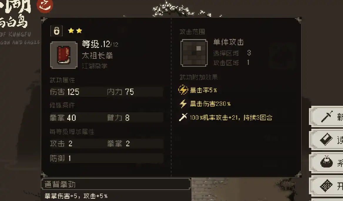 太祖长拳的暴击率数值为5%,拥有230%的暴击伤害,会有100%的概率增强基础攻击数值21点,持续的时间为三个回合,太祖长拳的满级伤害点数为125点,内力值加成为75点,修炼条件会高于灵狐拳法,需要四十点的拳掌属性和八点的臂力,但太祖长拳每升一级可以提升两点的基础攻击数值以及两点的拳法数值。