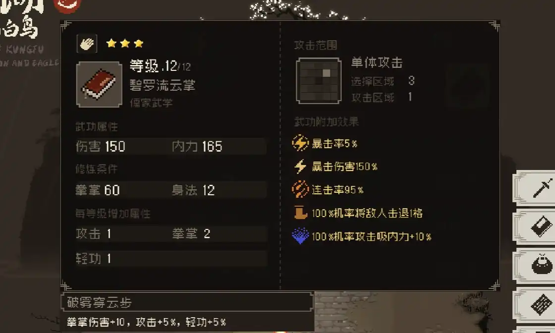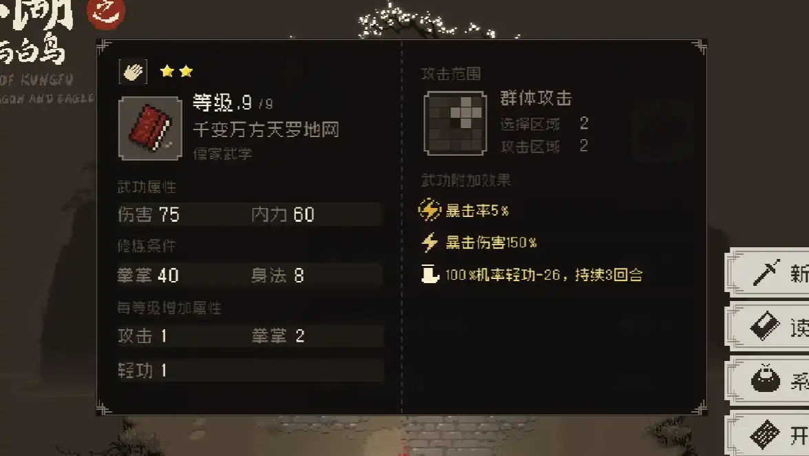 千变万方天罗地网则是游戏当中一个AOE的拳法,其获取的优先级并不高于前两种拳法,它可以对敌人造成穿透型伤害,并且有100%的概率,降低轻功所需要消耗的气力值26点,基础属性比太祖长拳略高一些,伤害数值为175点。