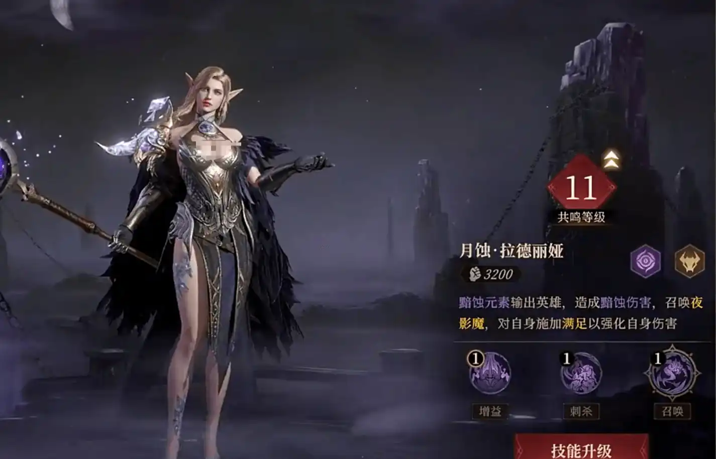 她的被动能在击败1位敌人后增加自己的输出值,她的战技会选择敌方血量最低的一个,直接位移到其区域,并以其为中心形成范围黯蚀伤害,目标每损失1%的生命,本次伤害就会提升1%,配合上被动击败增伤的机制,在战局中她将会得到源源不断的力量,她的大招会向着指定方向放出夜影魔,对路径上的敌人形成黯蚀输出值后,还会对夜影魔的降落区域再次形成伤害,如果夜影魔已经在场上的话,则会释放影,让夜影魔恢复全部的生命并持续施法5秒,期间每秒都会对周围敌人形成输出值,每次成功击败后自身还会得到一定的威能。