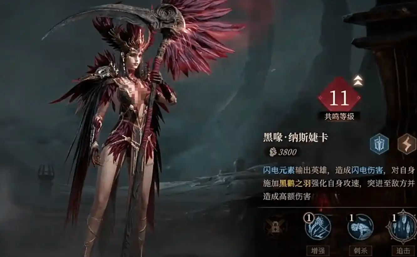 她拥有极强的单点破坏能力,是无畏流派的核心输出英雄,能直接突袭生命最低的敌人还能协同队友来发动攻击,队友的普攻频率越快越能为其带来更高的输出上限,她的被动会让自身每存活一段时间,就获得1层持续时长无限且不能被移除的黑鹳状态,并且自身会根据攻速来获得额外的重击率,她的技能会位移到目前场上最低生命值目标身边并造成3次闪电伤害,她的威能技会对一个范围内敌人形成一定闪电伤害,随后当我方的成员对任意目标发动普攻时,自身都有一定概率可以使用羽毛,再追加一次攻击,如果是无畏类目标的话,则有双倍概率触发。