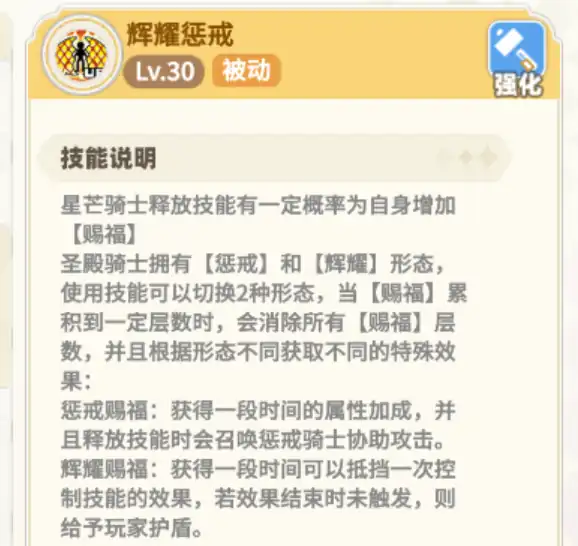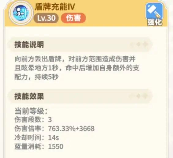核心的BUFF技能是【盾牌充能】,前期如果书不够,可以不强化,放在第一位使用即可,可以提升大量支配力,持续5秒,这也是锤盾前期主要的伤害来源。另外,【辉耀惩戒】(惩戒形态)也是前期的重要BUFF技能。