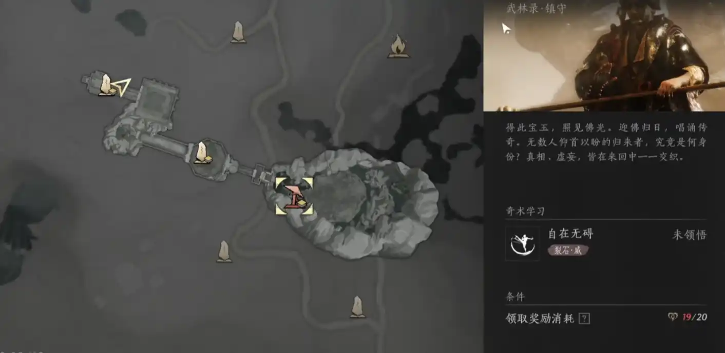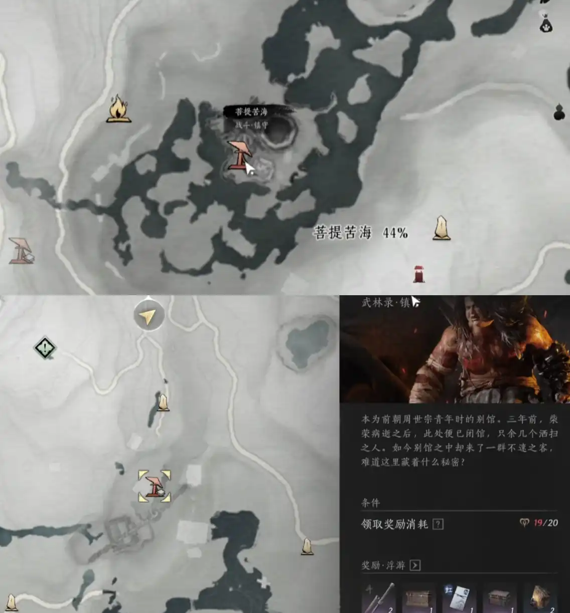还有一个条件就是要前往菩提苦海,这边也有一个镇守,如果没有将这个前置任务做了的话是无法开启后续的。除了这个,还有春秋别馆的镇守。这两个镇守打完了会分别给到一个阴石和阳石。