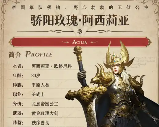是一个城堡的公主,是一个天生的战士,有一头金色的长发,浑身都会充满力量感和正义感。白金光辉属于一个战斗技能,可以给队友们带来可观的治疗效果。