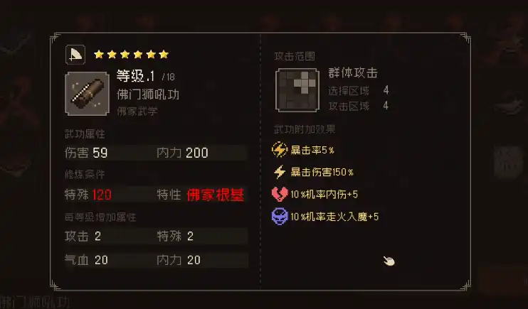 除了武功之外就是功法的选择,游戏里的功法多种多样,如果选择的是孤儿,那最最推荐的就是狮吼功,在后期可以借助孤儿的高道德值把狮吼功转化成其他的功法,但如果比较倾向其他角色的话,那就可以选择刀法或者剑法,这样就可以购买物资道具,这样就能让角色拥有更强的战斗能力。
