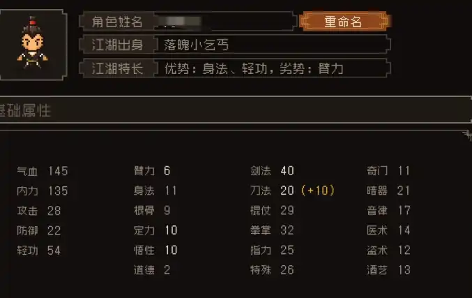 另外在游戏里比较推荐的还有小乞丐,这个小乞丐自身的身法和轻功都是非常优秀的,可以在后期学习西域的武学,只不过需要注意的是这个职业的角色臂力都会比较差一些,想要学习关于臂力武功的话,那就需要多去付出一些努力,提升角色的臂力,放牛娃和小乞丐的设定相似,只不过放牛娃在道德方面会更加优秀一些,高道德可以触发一些隐藏的剧情,这个角色也有劣势,就是悟性比较低,可以多去选择一些相对比较精明的武功。
