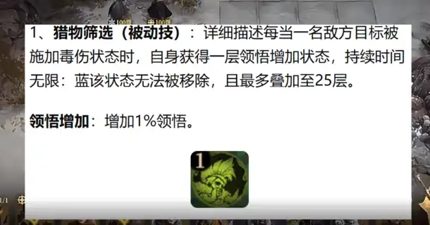 领悟属性一般和英雄的成长还有技能效果是紧密连接在一起的。将母狼维卡娜举例说明,猎物筛选是被动技能。每当一名敌方目标在被施加毒伤状态之后,就可以获得领悟增加能力。