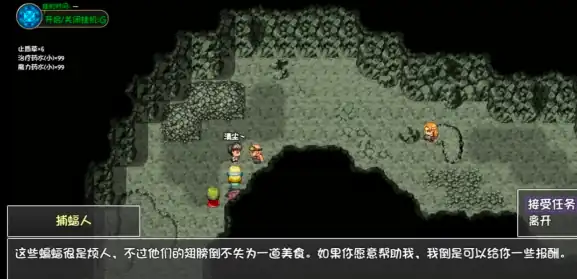 第二个任务地点是阴暗洞穴,玩家需要现在左上角寻找到捕蝠人,与他沟通后就可以开启任务,此时该NPC角色要求玩家收集七个蝙蝠翅膀,玩家进入到第一层打小怪就可以收集到这些翅膀。
