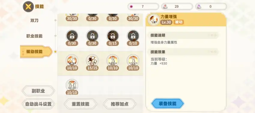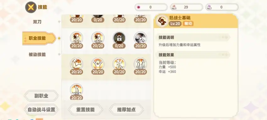 除了主动技能外职业技能的选择也同样重要,对于双刀职业而言,优先选择等价交换、夯实基础、攻击精通、暴击暴伤精通、天赋异禀、狂神之力和狂战士基础等技能,能够全面提升角色的战斗能力,特别是等价交换技能,它能够让玩家在战斗中灵活切换属性,以应对不同类型的敌人和战斗场景,在被动技能方面,老七样即大小攻击、背击、暴击暴伤、力量增强、幸运增强等依然是优先选择的对象。