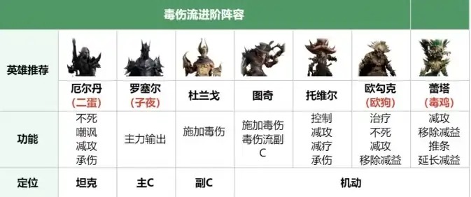除了强大的火系输出组合之外,在构建毒伤流阵容时,还需要着重考虑到毒伤输出英雄的挑选,毕竟这是整个阵容的灵魂所在,这些英雄擅长施展独特的技能,给敌人施加毒伤减益效果,一旦敌人被施加了这种效果,就仿佛被一张无形的网笼罩,生命值会持续不断地流失,基于毒伤流的特点,在这个精心设计的配队中,玩家们可以依据个人的游戏喜好和实际战斗情况,灵活选择3火2毒或者2毒3火的组合方式,以达到凑齐3人组的羁绊效果。