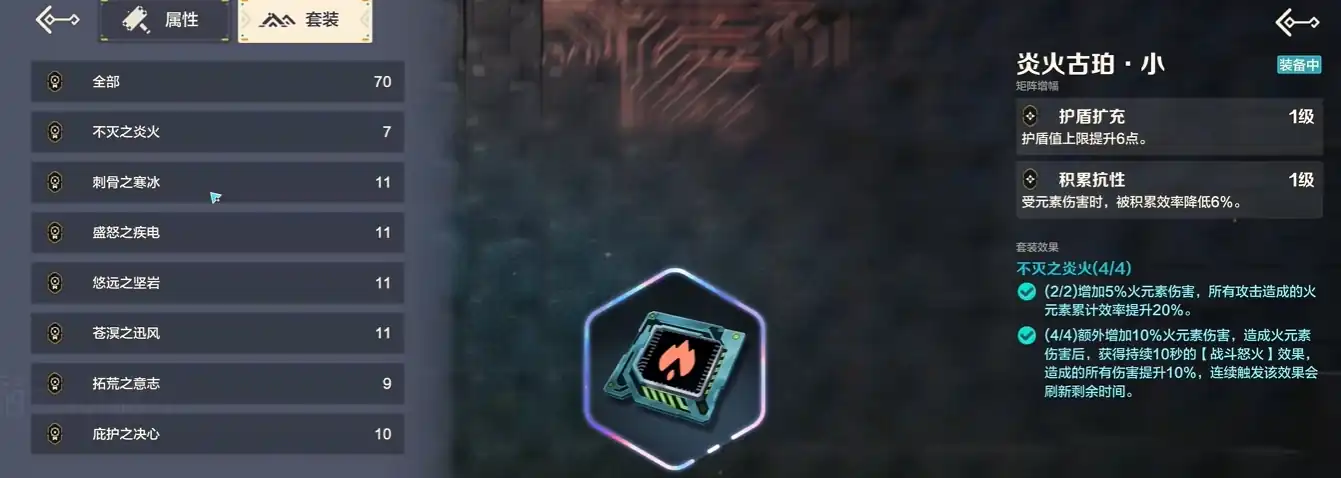 古珀的品质分为小、中及大三种,同类型古珀无论品质如何都可以组成套装效果,套装效果一般是2件套和4件套。2件套的效果是增强对应属性的伤害和提高元素累积效率,而4件套的效果则是进一步增加该元素的伤害并获得一种被动效果。