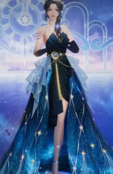 那么来看服装,游戏中服装都是以套装形式出现的,很少见到散件,因此要带大家看的都是套装,这第一套要带大家看的套装叫做幕间银河,这是一套星空主体的服装。之后是第二套服装琉璃风吟,这是一套风吟主体的裙装。