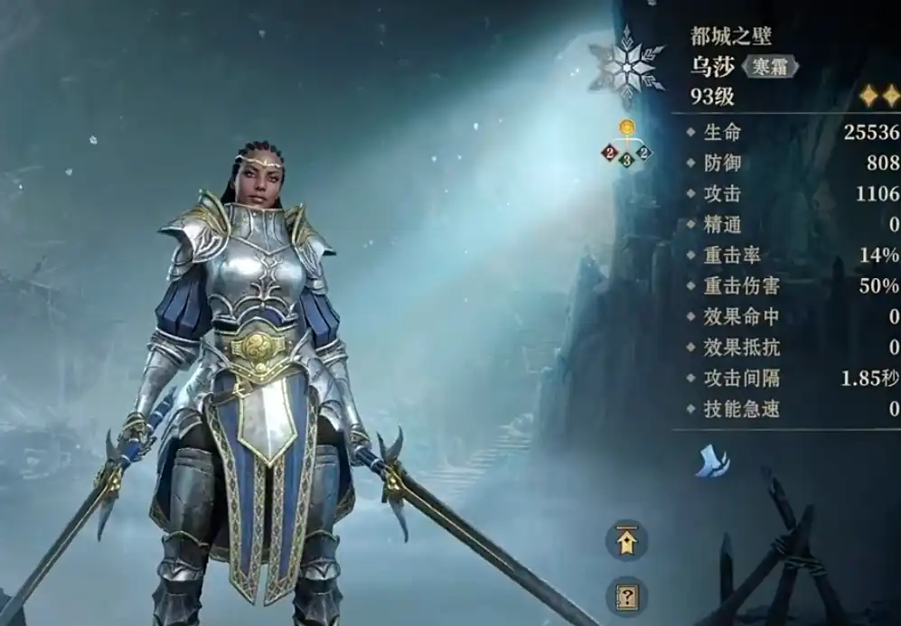 她的被动能让自身在对处于寒霜中的敌人进行第2次普攻时,伤害翻倍,她的战技能对自身施加一个护盾并且增加50%的攻击速度,她的大招能进行2次强力的斩击,每一次都会对范围内敌人形成冷伤并且100%施加寒霜10秒,该技能在攻击时也会对在寒霜中的敌人形成双倍伤害。