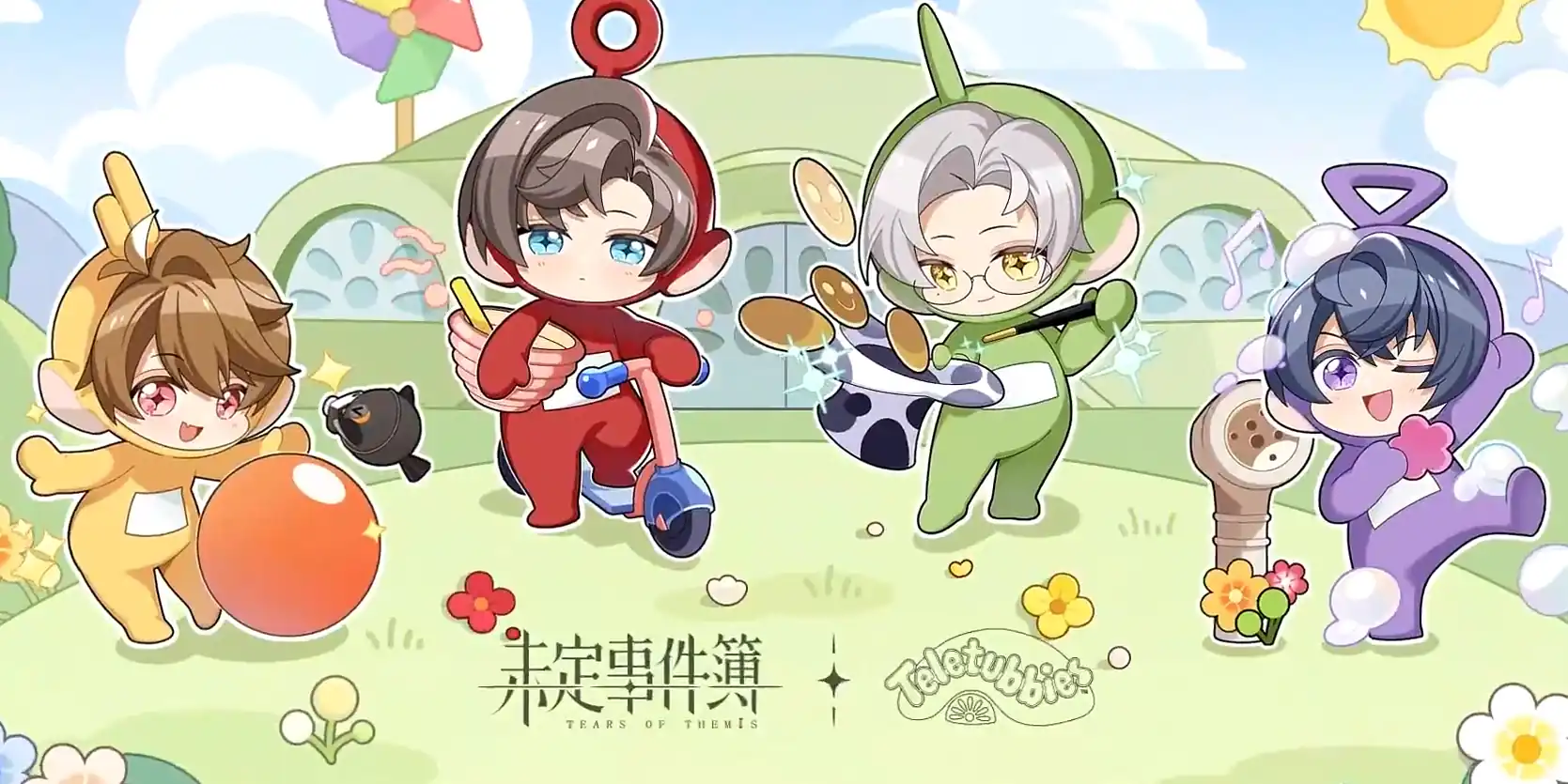 本次联动首先将带来联动专属的甜心系列服饰,有着一张娃娃脸,个性开朗的私家侦探夏彦将穿上天线宝宝的晒晒的服装,戴着的黄色帽子和球一起玩耍,能保持绝对理智和冷静的左然会穿上妮妮的服装,带着红色的帽子,用她的滑板车快速穿梭。
