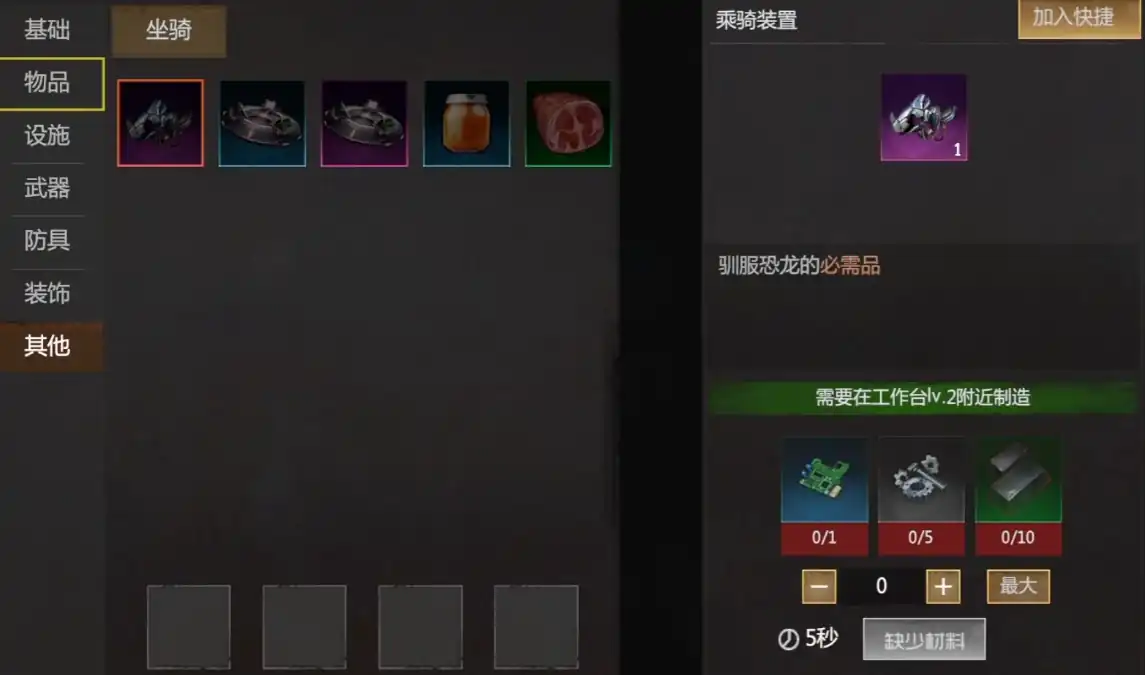 想要抓捕恐龙,我们首先需要打开制作台,点击进入其他,在这里能找到精密恐龙捕猎器、恐龙安定果酱和乘骑装置,根据下方的所需材料,将它们给制作出来,如果材料没有的情况下,大家可以点击缺少的材料,查看获取方式。