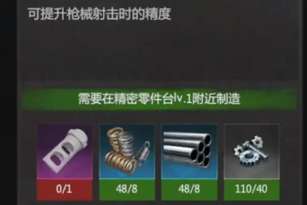 解锁成功之后,小伙伴们就可以把背包打开,然后开始建造精密零件台。建造成功之后,小伙伴们再次打开背包,取出相对应的模具,即可开始制造配件,一次性可以制造多个配件。在制造时,小伙伴们可以在配方中看到本次制造所需要消耗的材料以及你所制造配件的具体属性。因此大家需要确认自己身上的材料足够才能够进行制造。