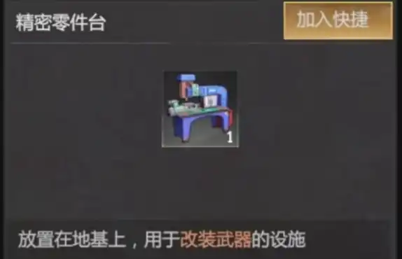 每一把枪支上可以更换的配件一共有4个,分别为瞄准镜,枪托,弹夹和枪口。但是以上这些配件都是无法直接获得的,玩家们要做的第1步是获得模具,目前来说获得模具的途径一共有两个,第1个是打败特定的boss,第2个是开启高级据点宝箱。接下来小伙伴们需要看一下自己是否解锁了精密零件台,如果没有解锁的话,需要先打开书架这个选项消耗一定的科研点数来激活。