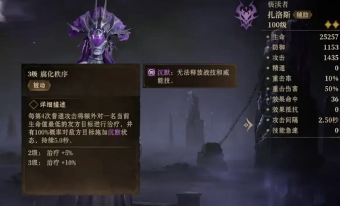 他的被动能在第4次普攻时,额外对一位生命值最低的队友进行一次治疗,并100%对敌人施加沉默,让其无法释放战技和大招,他的战技会对范围内敌人形成380%的黯蚀伤害,并且有75%概率降低其30%的充能速度,他的大招能在指定地点召唤1个持续5秒的囚牢,囚牢存在期间每1秒就会对范围内敌人形成黯蚀输出值,并且有35%概率施加恐惧5秒,让其无法普攻和释放技能,最后对所有队友进行治疗,在这之前每命中1位敌人都会让治疗量增加15%。