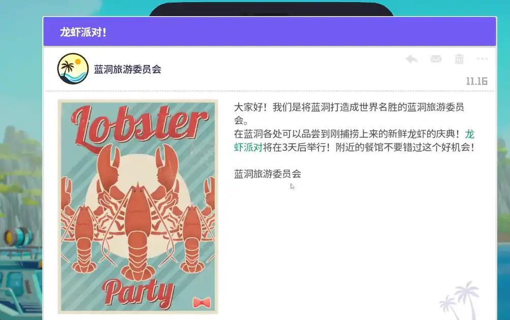 龙虾派对是潜水员戴夫中的特殊活动,每当它开启时,玩家的寿司店将转向海鲜的盛宴,所有菜品都必须与龙虾相关。如果你没有准备好充足的食材和菜谱,那么当派对开始时,你可就只能干着急了。龙虾派对的核心菜品是龙虾拼盘,其中主要食材包括:锦绣龙虾、美洲龙虾、以及抓都空虫。这几样食材的搭配,将让你的菜肴兼具龙虾的鲜美与昆虫的独特风味,是不是听起来就非常有挑战性呢?