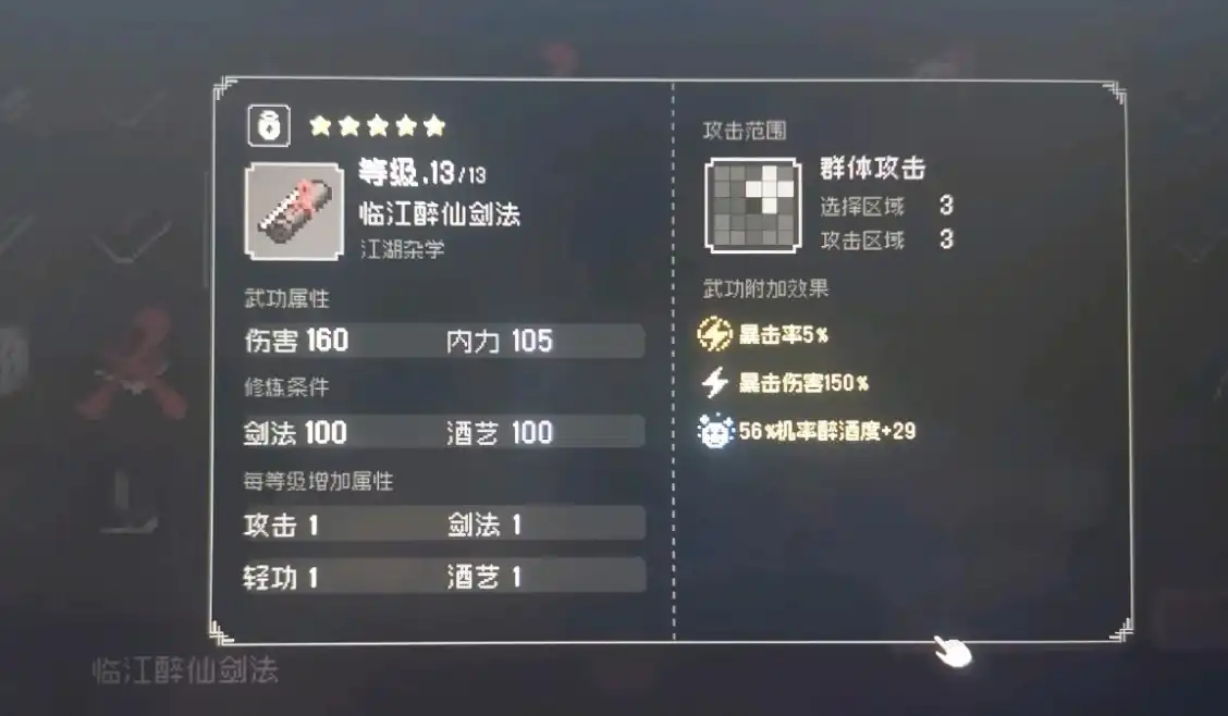 在功法搭配方面,太祖长拳是与醉拳相得益彰的绝佳选择。当角色处于醉酒状态时使用太祖长拳,会额外增加攻击,让敌人防不胜防。获取太祖长拳,需要玩家进入樊楼的山洞,击败白无常后,在三斗坪水道内通过掘墓获取,但掘墓会降低玩家的道德点数,所以比较适合非道德流派的玩家选用。除了太祖长拳,玩家还可以寻找一些能够增加酒意或提升醉酒状态下战斗力的功法和道具。比如,前往卖货郎处购买南部烟花录,使用后可以增加酒意;在临江城大地图右边客栈二楼向富商购买夜光杯,当酒意达到30以上使用,同样能增加酒意。而在铁沙帮黑泥沼处获得的酒鬼望月杖,也是醉拳流派的重要装备之一。