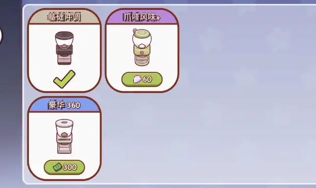在经营日的第一天,玩家只能获得基础的咖啡机,当有60云朵币的时候就能升级为绿色“抓哇风格”咖啡机,这个咖啡机通体绿色,多数以原型为造型,比较可爱。想要更加高级点的话就是价值300钱币值的豪华级别的咖啡机。