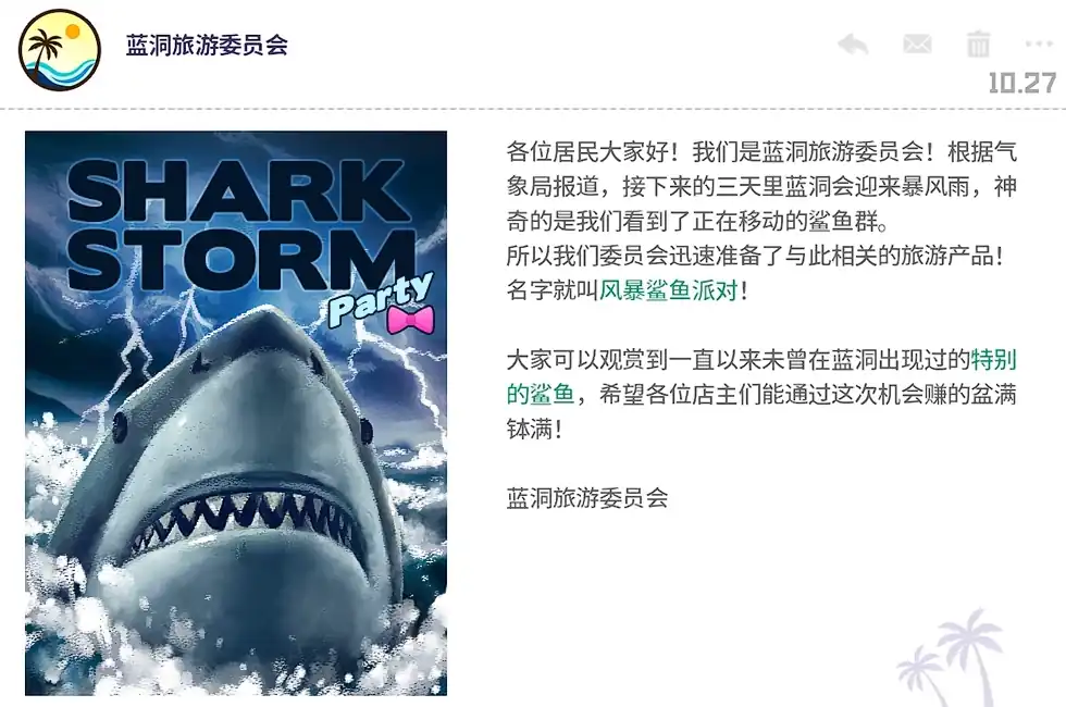 水母派对是玩家们在主线中所遇到的第一个派对,在进入第二章的主线后就会有相关的邮件弹出。而在水母派对结束后,马上来到的就是金枪鱼派对,以及旗鱼派对。这两个派对都结束后,下一个轮到的就是鲨鱼派对。到了这里,玩家们的主线也都差不多全做完了。