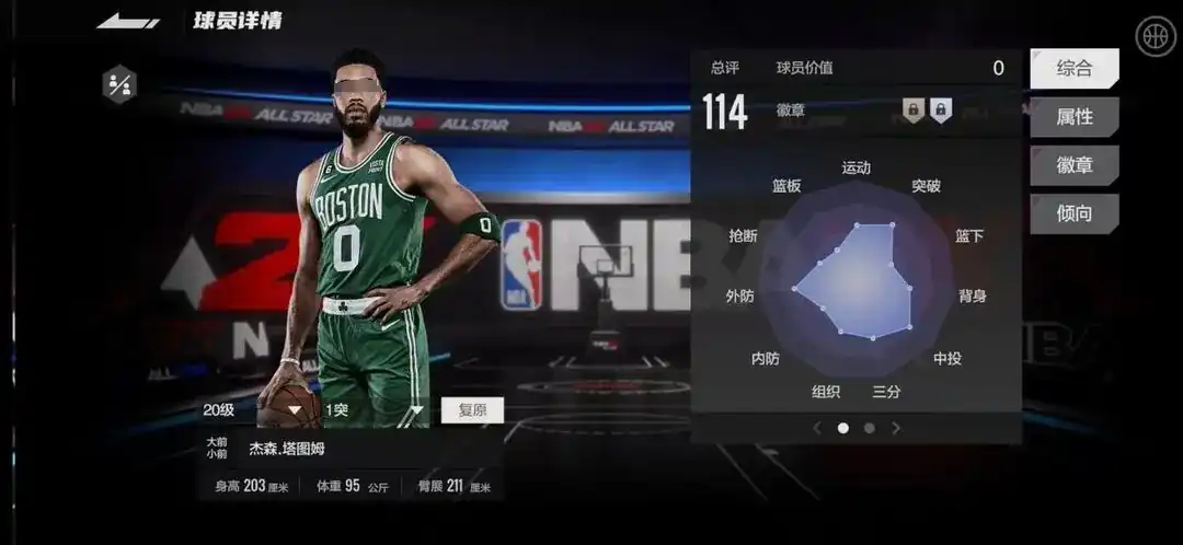 塔图姆在游戏中的定位是大小前锋。其实这都得益于他高挑的身材,有着203cm的身高。以及高达95kg的体重,但能让他在球场上中轻松防守敌人,可避免对方进攻还可以快速进行回防。他最出色的能力就是外防,可以轻松用双手展开防住敌人。